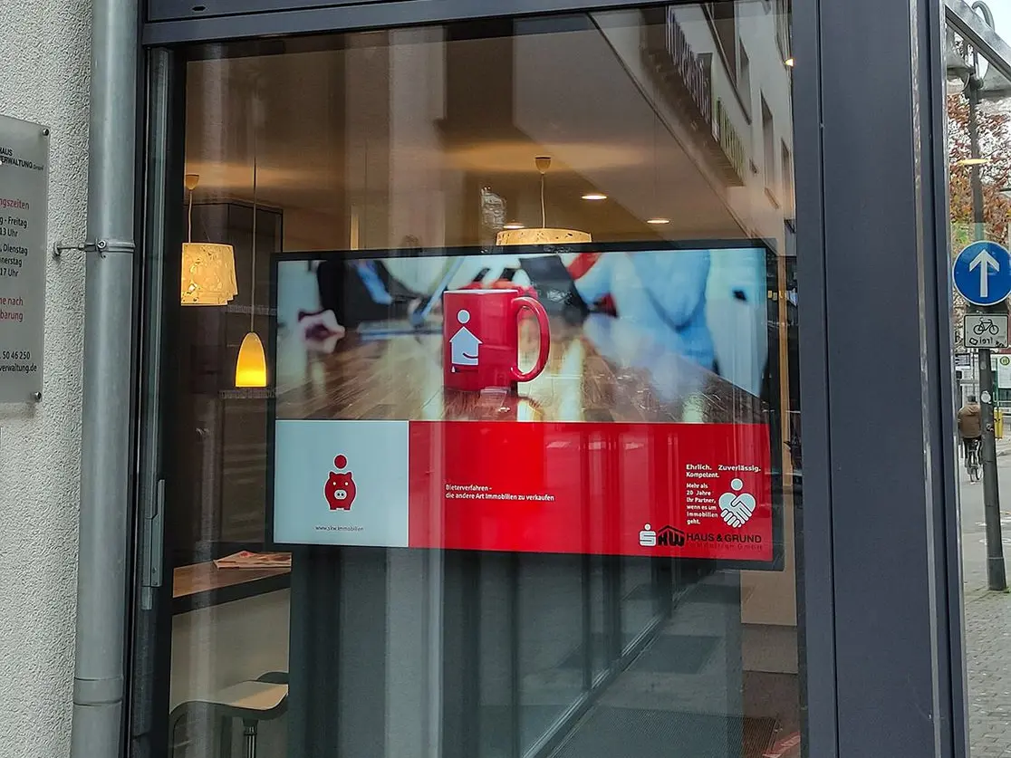 Auf sechs davon präsentieren wir automatisiert unsere aktuellen Immobilienangebote, die täglich mit unserer Immobiliensoftware synchronisiert werden. Die weiteren drei Displays nutzen wir für individuell anpassbare Werbeinhalte, die wir bequem webbasiert aktualisieren können. Wir sind mit der Lösung und der Zusammenarbeit äußerst zufrieden und freuen uns, als Referenzkunde genannt zu werden.