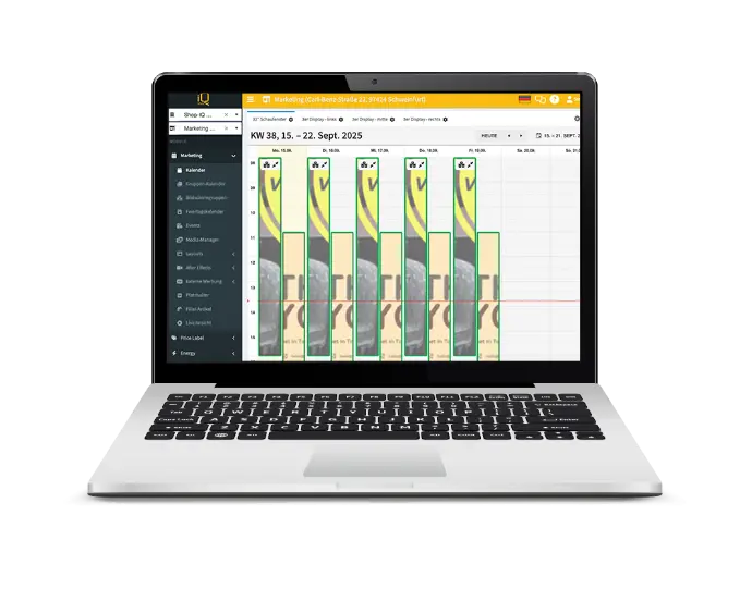 Mit der Shop-IQ Webapp behalten Sie Ihre Filialen stets im Blick und steuern diese bequem online. Nutzen Sie vielseitige Funktionen wie den Gruppenkalender, mit dem Sie mehrere Filialen bündeln und so Zeit im Alltag sparen. Dank der direkten Verknüpfung mit der Warenwirtschaft passen sich Preise auf den Displays automatisch an.
