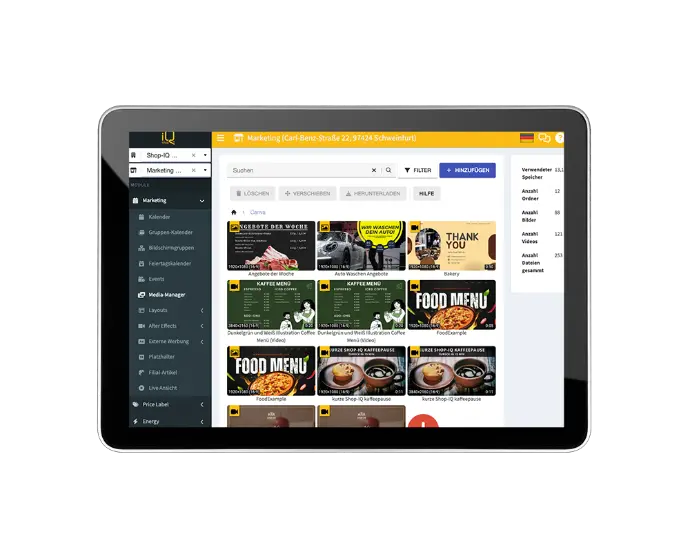 Mit dem Shop-IQ Modul Marketing steuern Sie Ihre Inhalte ganz bequem über die Shop-IQ Web-App. Die Ausspielung erfolgt direkt auf das Display – ohne externen Hardware-Player. Das spart Anschaffungskosten, reduziert Wartungsaufwand, reduziert Ihre Energiekosten und macht Ihre Digital Signage Lösung besonders schlank und modern.
